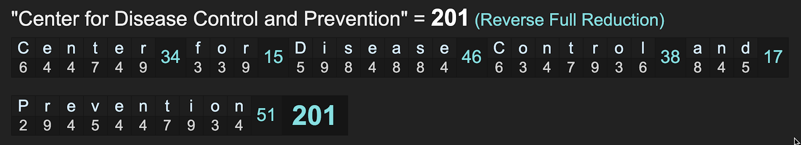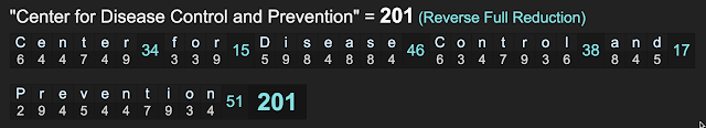 For the record, ‘Center for Disease Control and Prevention’ sums to 201, like Event 201, the Coronavirus Pandemic simulation of October 18, 2019.