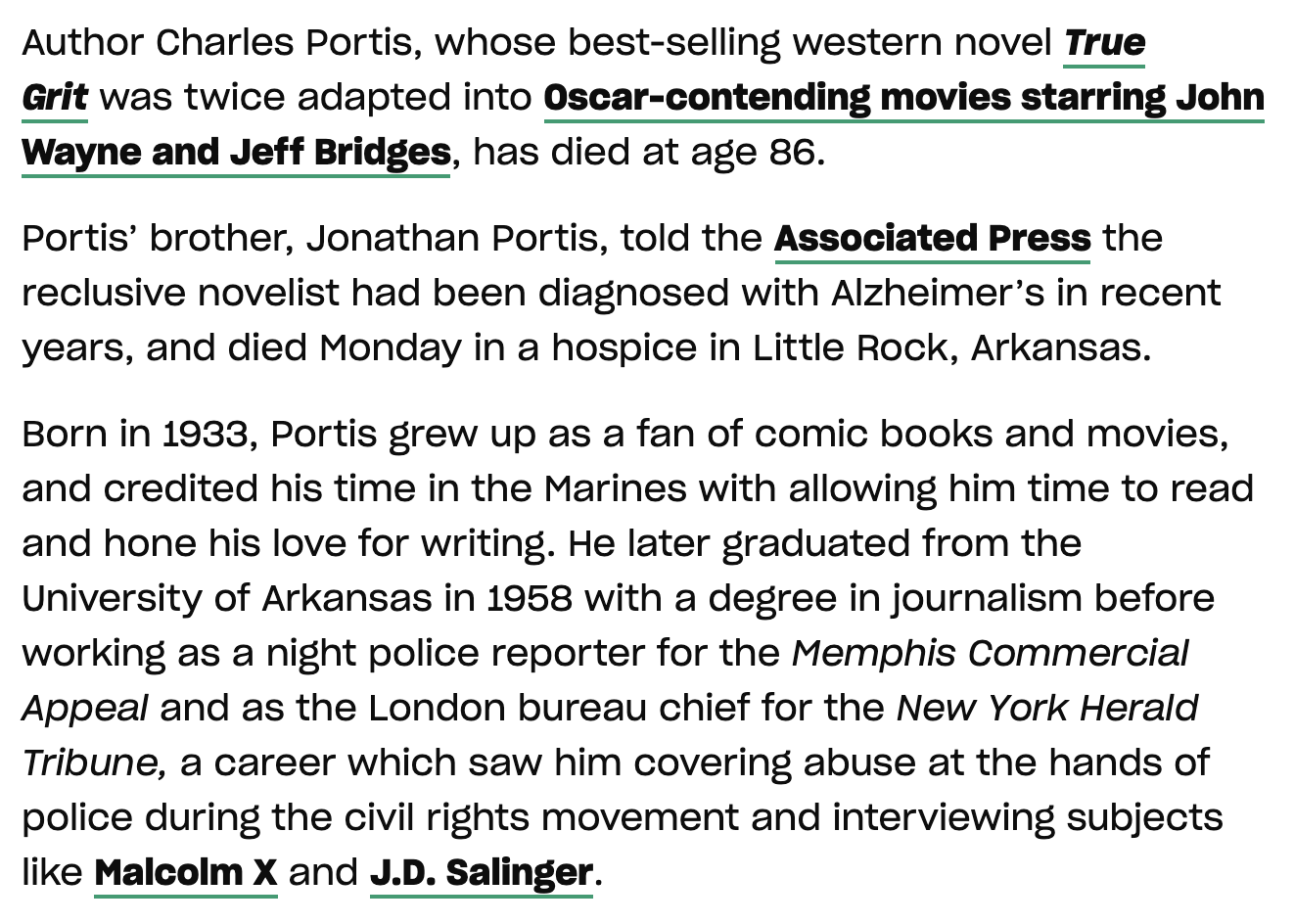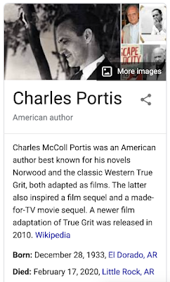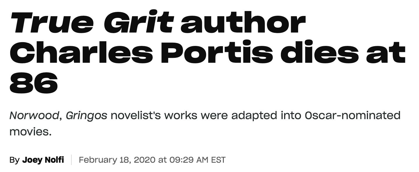 Charles McColl Portis, author of Norwood and True Grit, dead at 86, February 17, 2020.