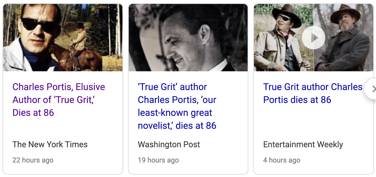 Charles Portis, author of True Grit, dead at 86, February 17, 2020 +Jeff Bridges, star of latest film