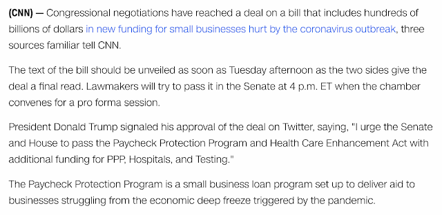 I doubt Trump will putt as nice of a signature on this as he did the $6.2-trillion that went to the Swiss banks and mega-corporations. Keep in mind that money went to very few, whereas this $450-billion, about 15 times less than the $6.2-trillion, will be needed by VERY MANY.