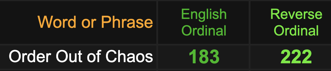 The motto of the Scottish Rite, is ‘order out of chaos’, which is a concept that Icke explains in the interview. Notice how the gematria of ‘order out of chaos’ sums to 183, like the date 18/3, March 18.