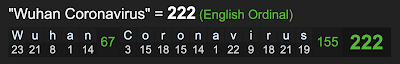 Read more about 222 and this being declared a pandemic, March 11, 2020, 222-months on the nose after September 11, 2001: https://gematriaeffect.news/222-weeks-from-september-11-2001-to-march-11-2020-order-out-of-chaos/
