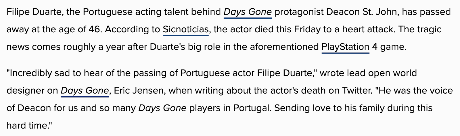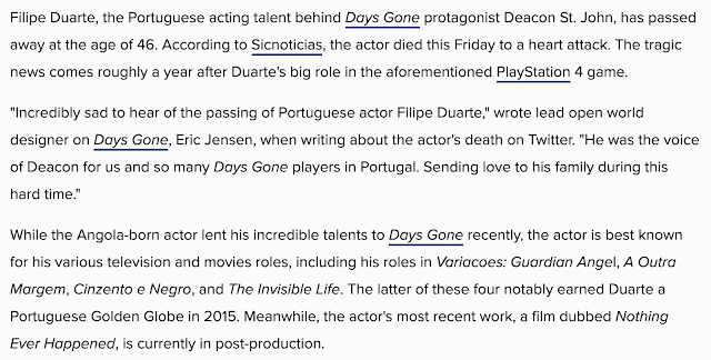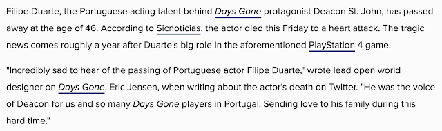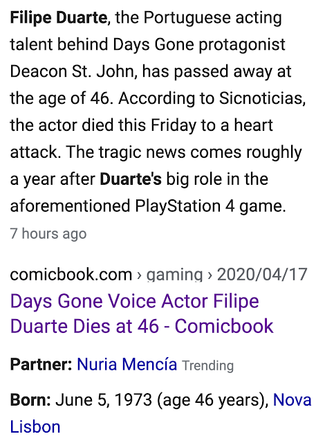 Days Gone voice actor, Filipe Duarte, dead at 46, April 17, 2020 +Same day as news of Paul Haddad of Resident Evil