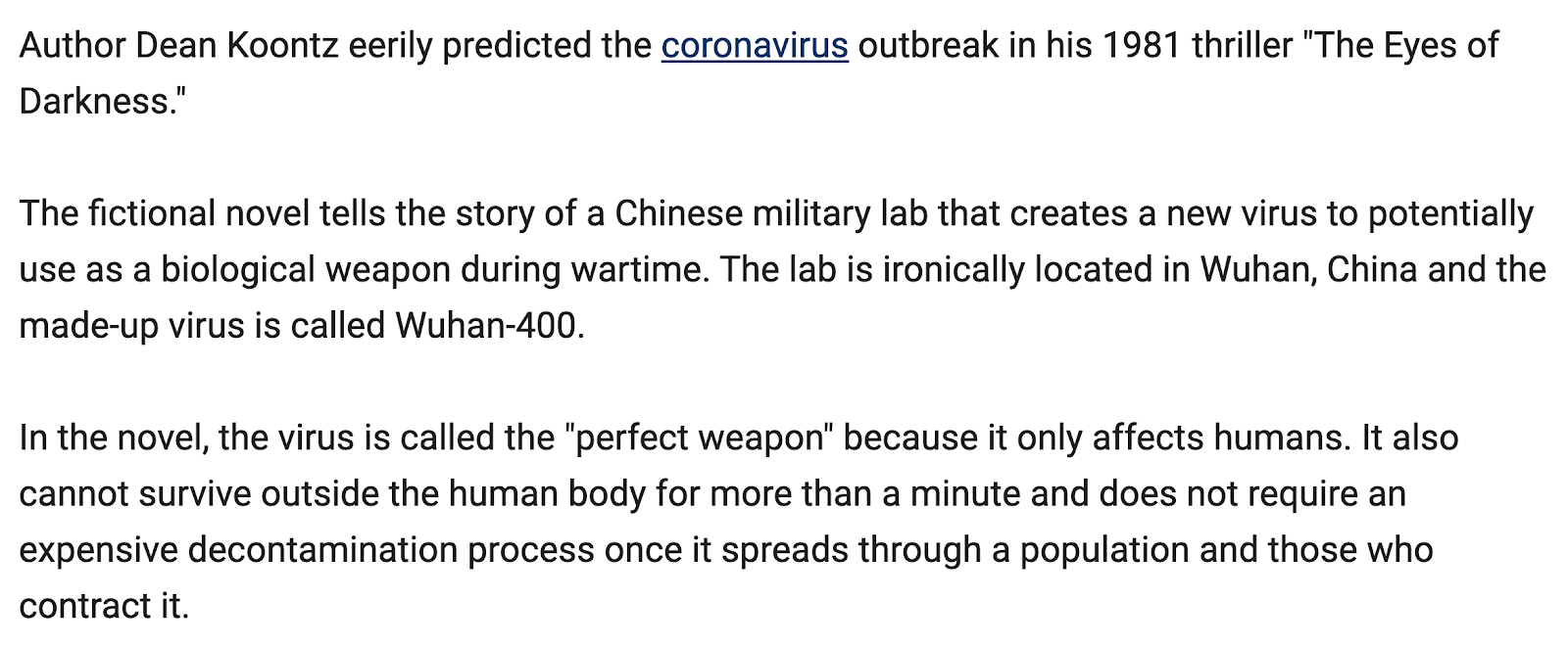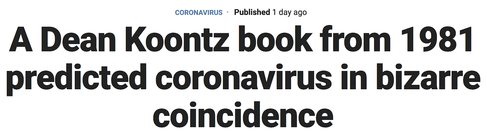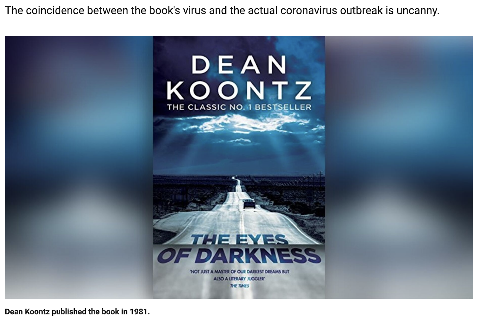https://www.foxnews.com/entertainment/dean-koontz-book-predicted-coronavirus?fbclid=IwAR1tN0g4H5ZycorHTEqabKkWnu5mcMKmbgXmy6zArl8OQCi-18dzyd0BZsE