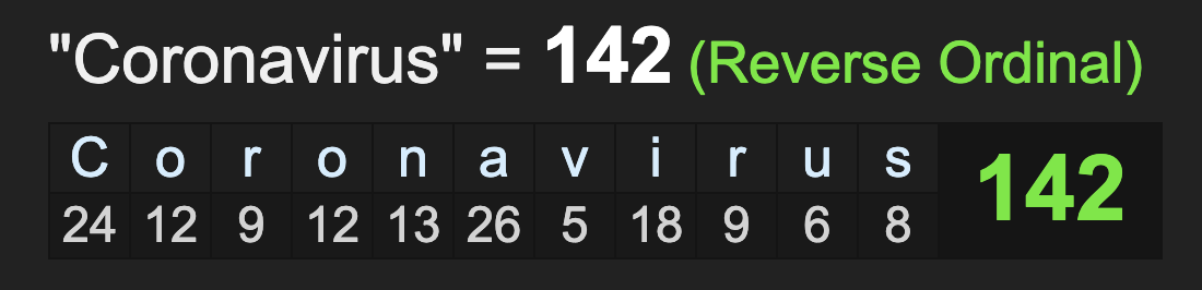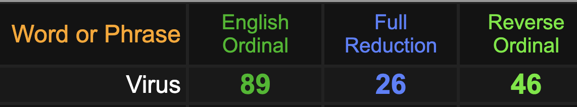 The name also sums to 67, the 19th prime, like how the first case of ‘Wuhan’ in the U.S., was found in ‘Seattle’. *Wuhan = 67 *Seattle = 19