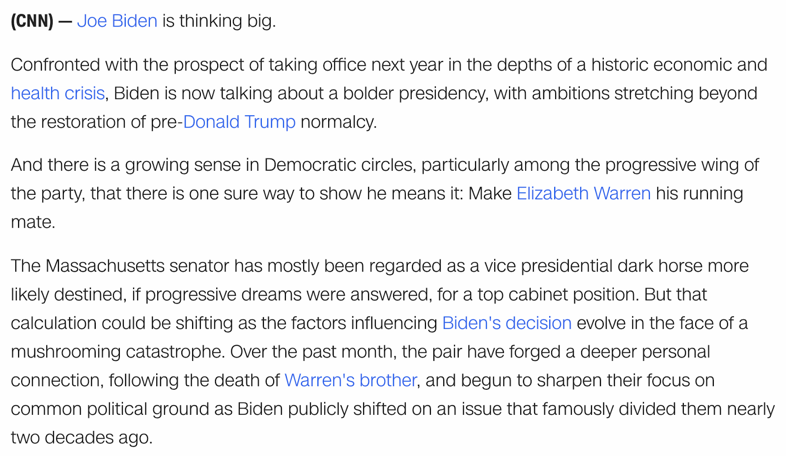 If you read the article, it focuses much on how coronavirus has made Elizabeth Warren’s mission of ‘medicare for all’ a real possibly, and that is why she might be the right choice for Biden at this moment. Notice how her birthday syncs up with today’s article, and her running with Biden.