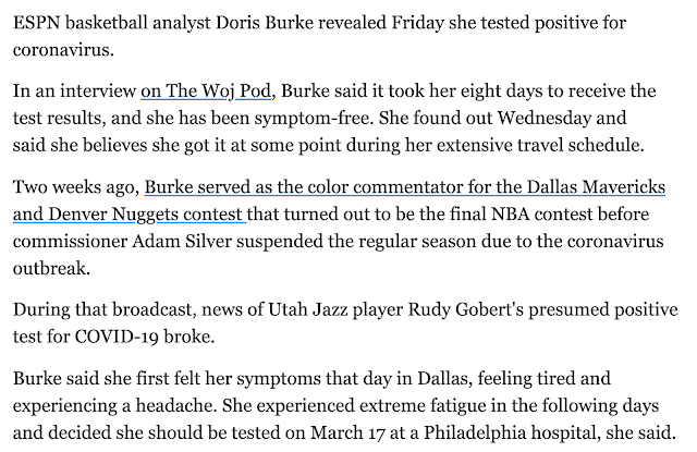 Doris Burke, ESPN NBA Analyst, tests positive for coronavirus, March 27, 2020 news