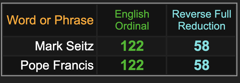 Notice how the name Mark Seitz sums to 122 and 58, same as ‘Pope Francis’.