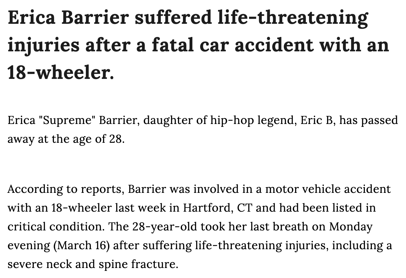 Eric B.’s daughter dead at 28, March 16, 2020, after car accident with 18-wheeler