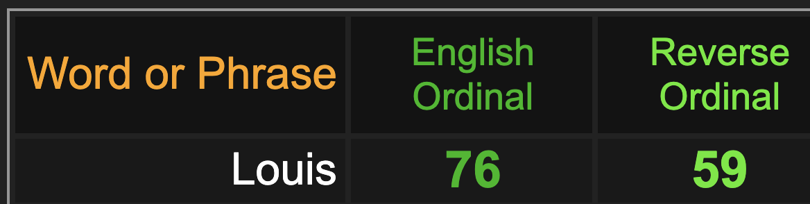 Further, notice his birth name is Louis.  His daughter died on the 76th day of the year, and on a date with 59 numerology.