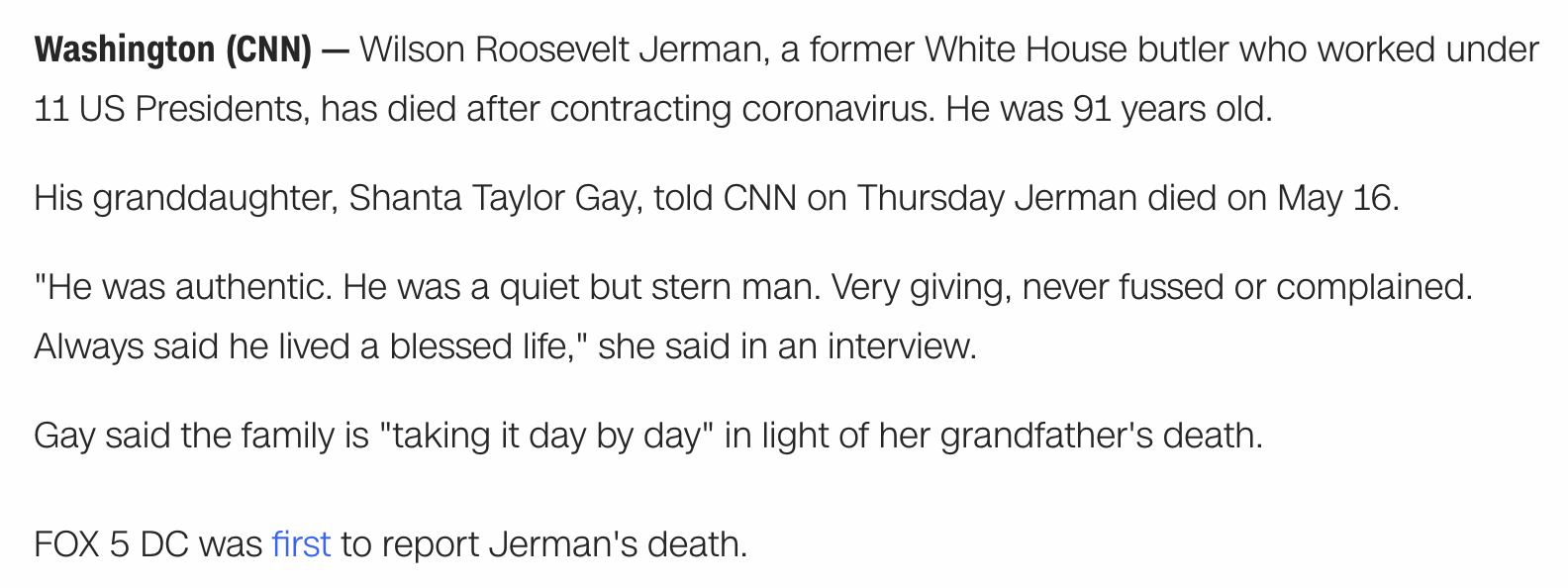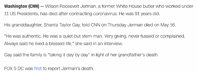 Former White House butler, Wilson Roosevelt Jerman, who served 11 U.S. presidents, dead from coronavirus, May 21, 2020 news