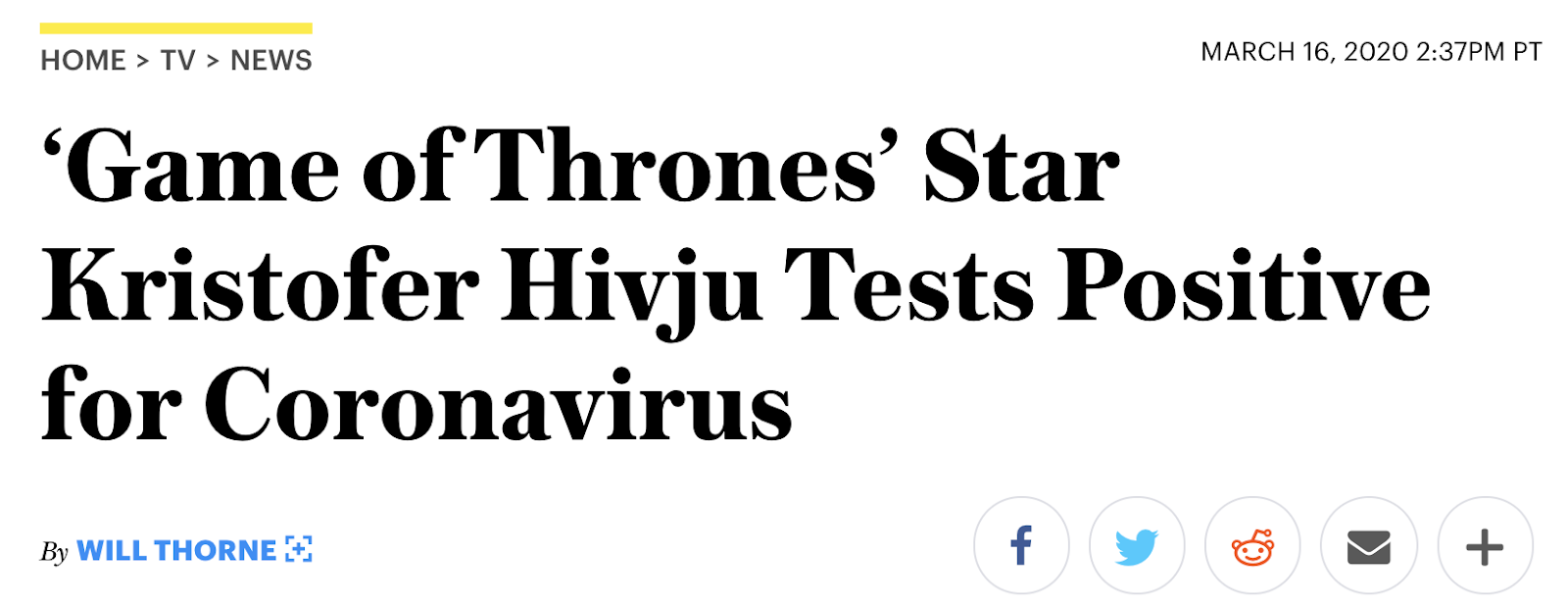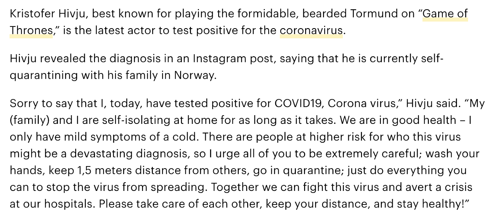 Game of Thrones actor Kristofer Hivju tests positive for coronavirus, March 16, 2020 news