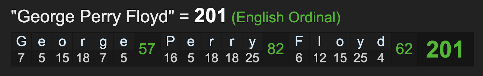 Read more about Geoge Floyd and 201: https://gematriaeffect.news/white-bar-owner-kills-black-george-floyd-protester-james-scurlock-saturday-may-30-2020/