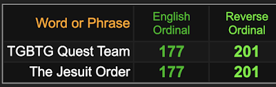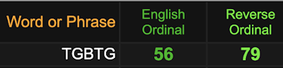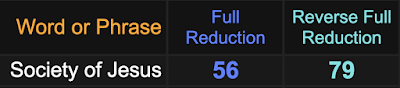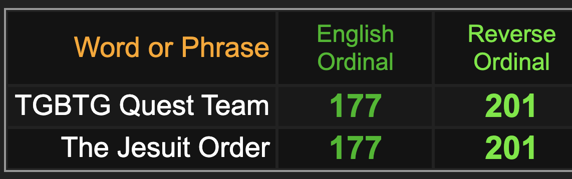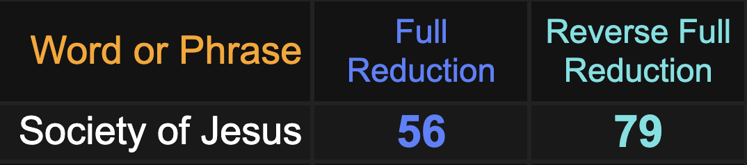 Notice TGBTG sums to 56 and 79, the same as ‘Society of Jesus’, the official the name of The Jesuit Order.
