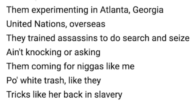 Atlanta is where the CDC is, or the Center for Disease Control and Prevention. They are central to Event 201 and the ongoing coronavirus outbreak agenda. As the lyrics state, coronavirus is targeted at the poor, just as they state in the Event 201 simulation.