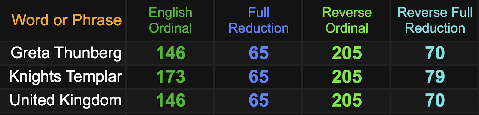 Notice how the gematria of ‘Greta Thunberg’ overlaps with Knights Templar and United Kingdom, two of the very key players in this contrived coronavirus outbreak ordeal.