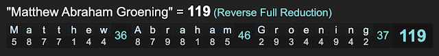 Keep in mind Matt Groening is the writer of the Simpson’s, his full name Matthew Abraham Groening having the 119 gematria.