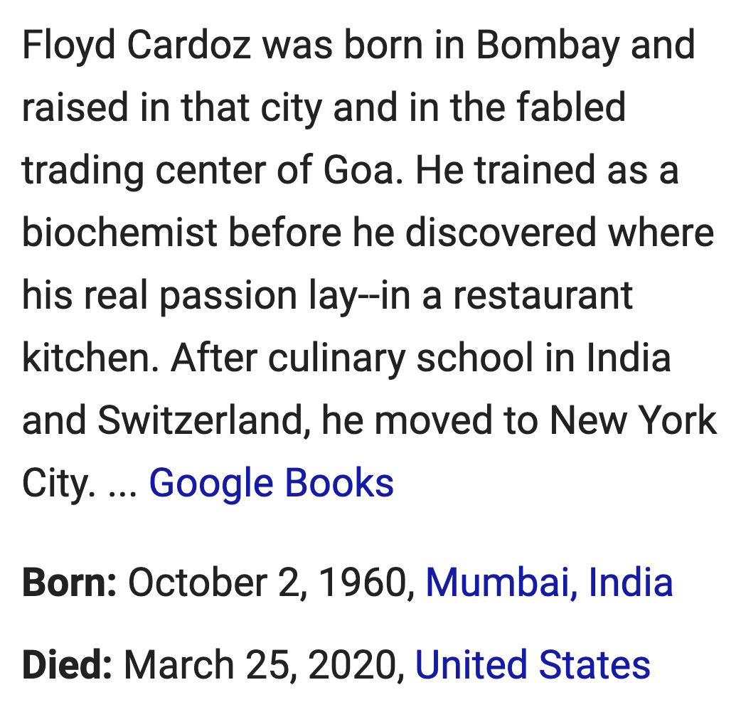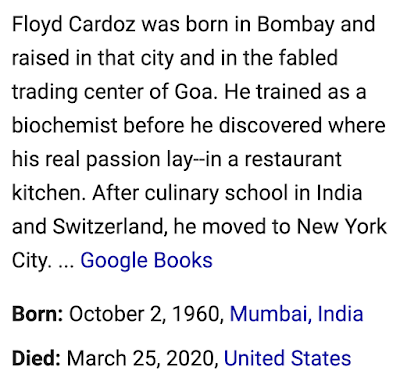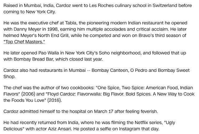 Indian Top Chef Masters winner, Floyd Cardoz, dead from coronavirus, shortly after India goes into lockdown for the virus, March 25, 2020 news
