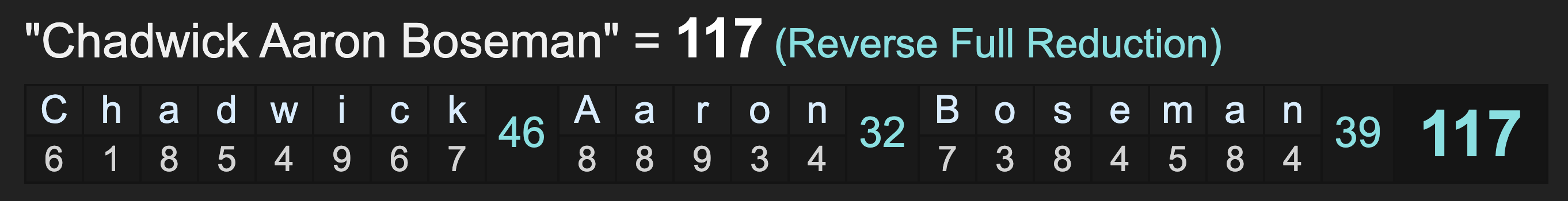 His name, Chadwick Boseman, equates to 59, like ‘negro’, ‘slave’ and ‘blues’.