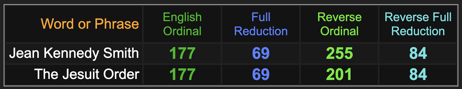 For one last point, JFK died 177 days after his birthday, and the name ‘Jean Kennedy Smith’ sums to 177, as well as 69 and 84, just like ‘The Jesuit Order’.