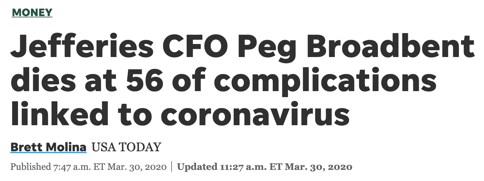 Jefferies Group CFO dies at age 56 from coronavirus, Sunday, March 29, 2020
