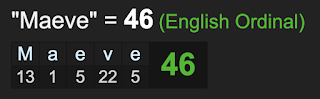 The name ‘Maeve’ sums to 46, like ‘sacrifice’, matching the age that JFK died at, the first ‘Catholic’ president, and the only, who was also #35.
