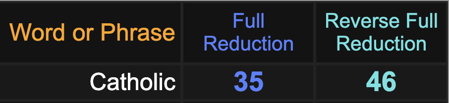The name ‘Maeve’ sums to 46, like ‘sacrifice’, matching the age that JFK died at, the first ‘Catholic’ president, and the only, who was also #35.