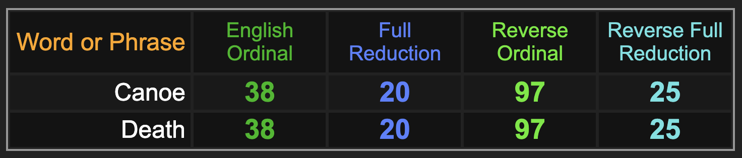 We’ll begin with the gematria of ‘canoe’, and its relationship with ‘death’.