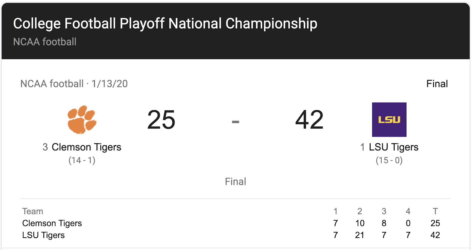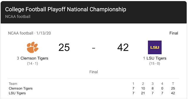 Recall, the LSU Tigers beat the Clemson Tigers on January 13, or 1/13.
