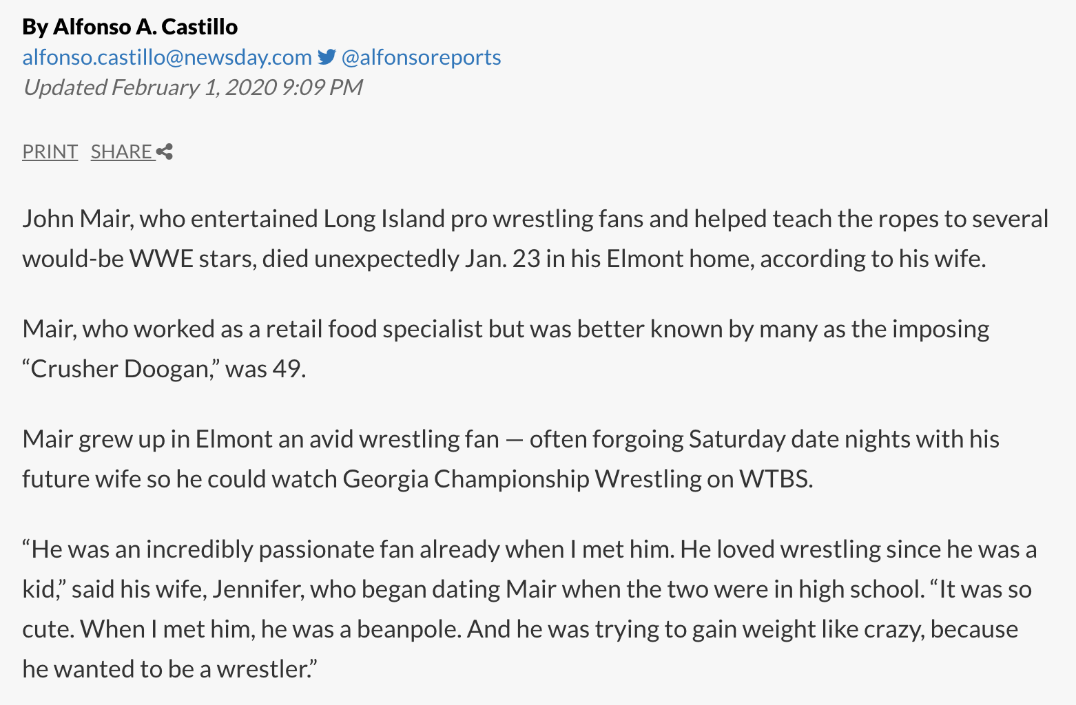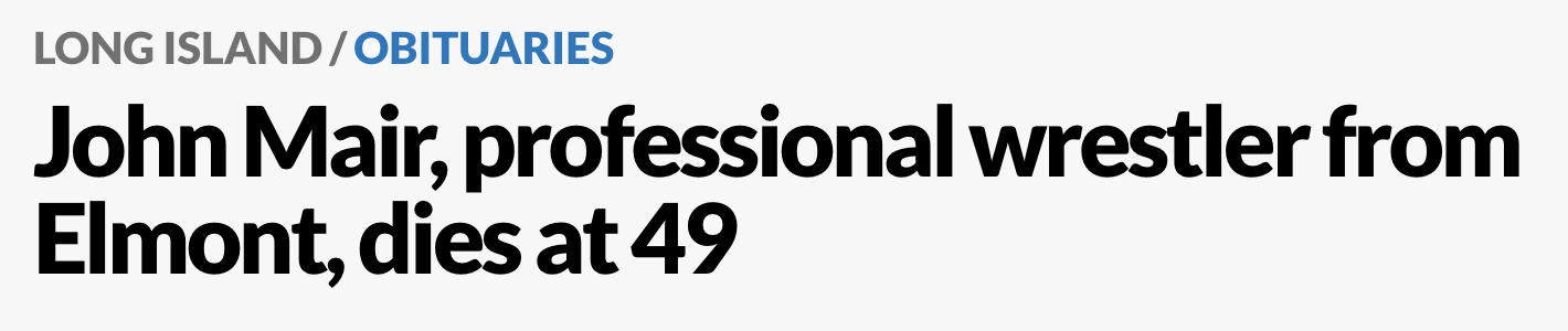 John Mair, wrestler, dead at 49, January 23, 2020 +February 1, 2020 news