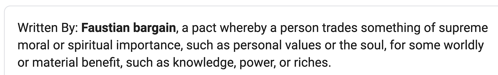 Again, a ‘Faustian Bargain’ is a deal where you sell your soul for fame and material success. The character who makes the deal in the story is known as Doctor Faustus, or for short, Faust.