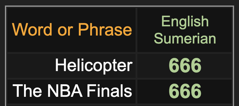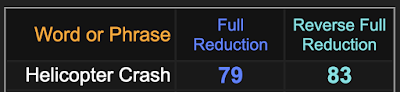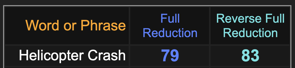 Don’t forget the gematria of ‘helicopter crash’ and ‘murder’.