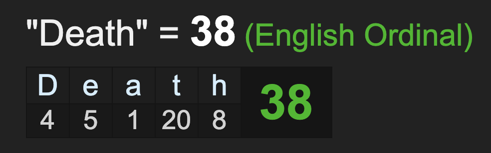 *Notice it was 3-months and 8-days as well *Death = 38; Murder = 38; Killing = 38; RIP = 38