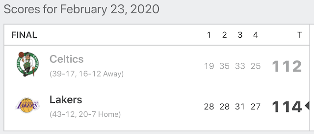 The Lakers would score another 33-points from there, to win the game. Consider the Lakers and Celtics have 33 combined championships. Also LeBron James would put in the winning basket, to give the team 114 total points and the W.