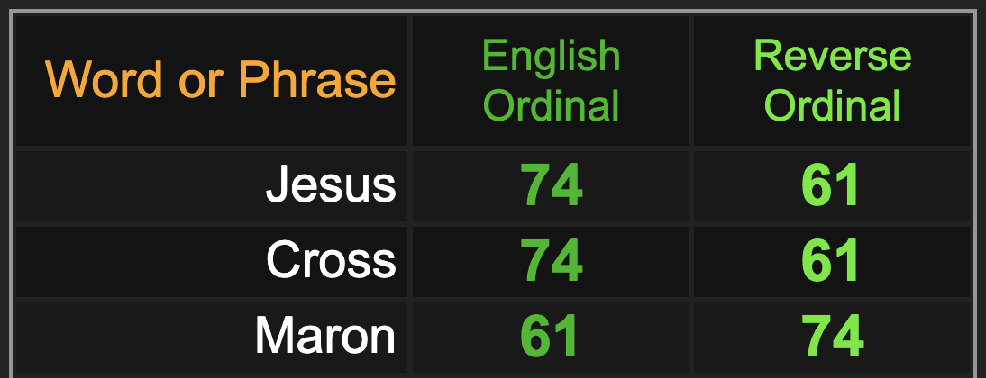 The name ‘Maron’ sums to 74, and you know how Jesus, 74 and 33 go together.