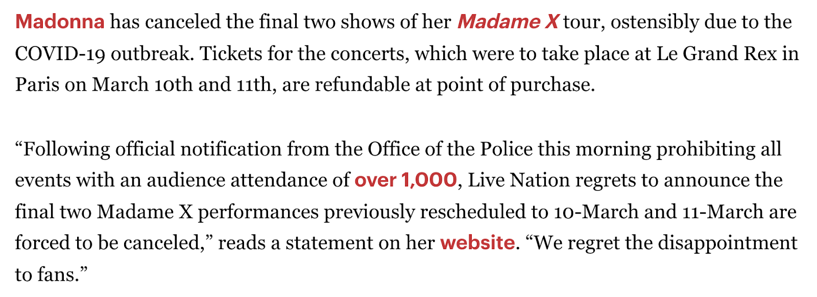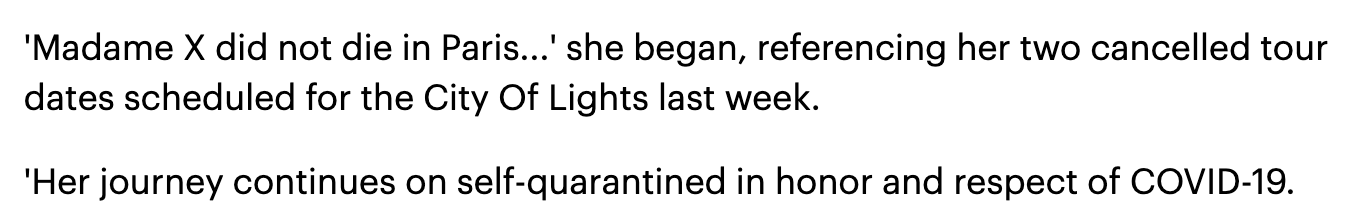 Let us begin with this stat. From Madame X’s release date, to the first coronavirus case being found in the U.S., was a span of 222-days.