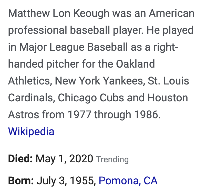 Matt Keough has died May 1, 2020, what is the 121st day of the year in non-leap-years.