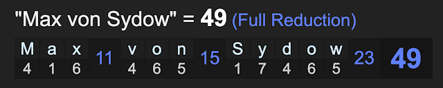 Of course, Revelation, where the verse about the seventh seal comes from, is a book of death and destruction. It is also based on the 39 books of the Old Testament, and notice the news comes on March 9, or 3/9. Speaking of Revelation, that is where the name Max von Sydow fits in.