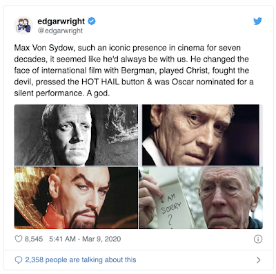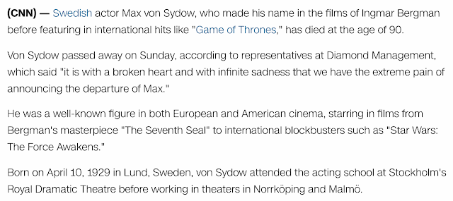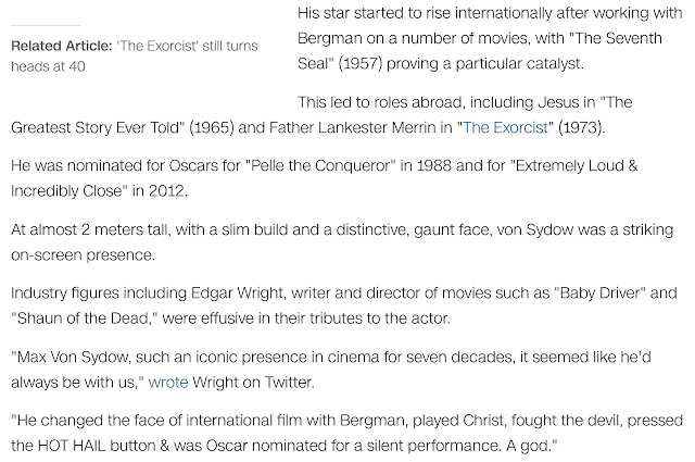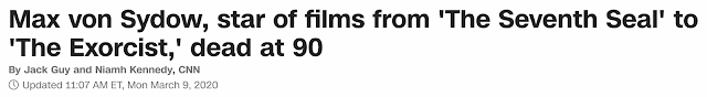 Max von Sydow, Seventh Seal, Exorcist, GOT, & Greatest Story Ever Told actor, dead at 90, Sunday, March 8, 2020 +How it fits in with the coronavirus outbreak
