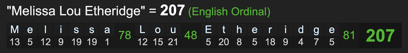 Melissa Etheridge won her first Grammy in 1993, 27-years ago.  Of course, the numbers 93 and 21 are associated with Saturn, connected to death and judgement.