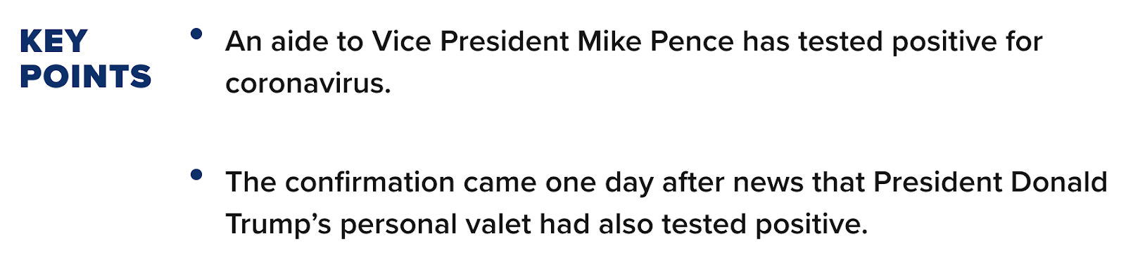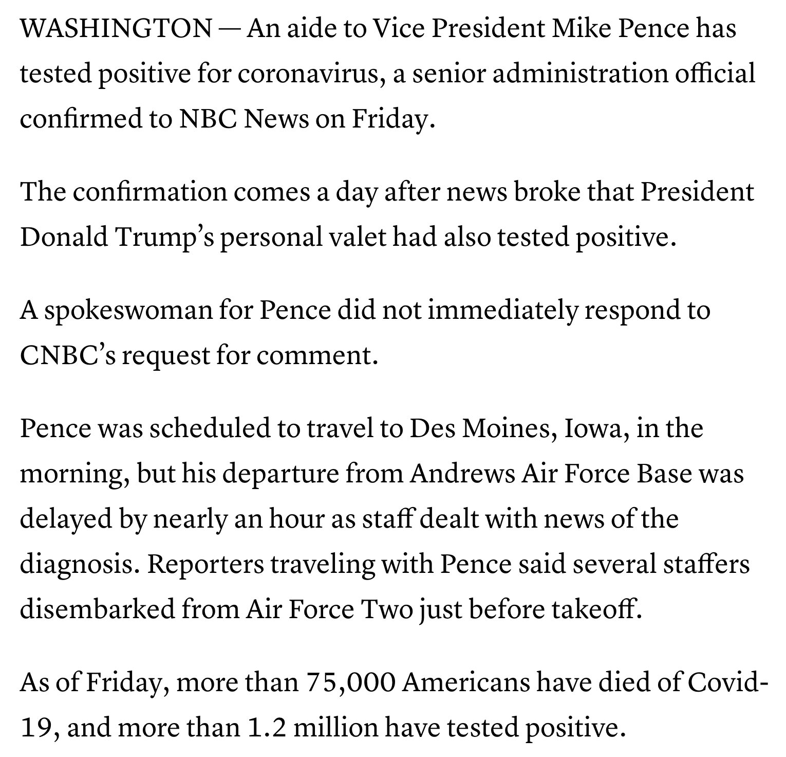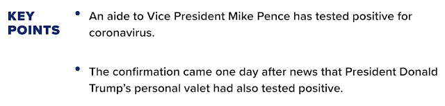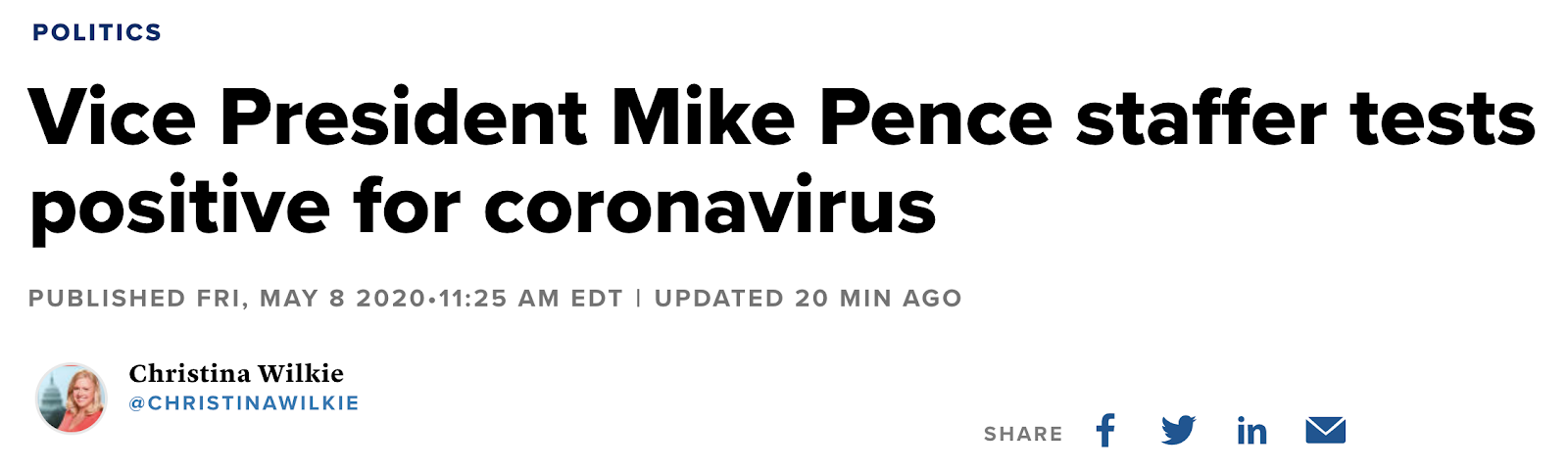 Mike Pence staffer tests positive for coronavirus, May 8, 2020, one day after Trump valet tests positive