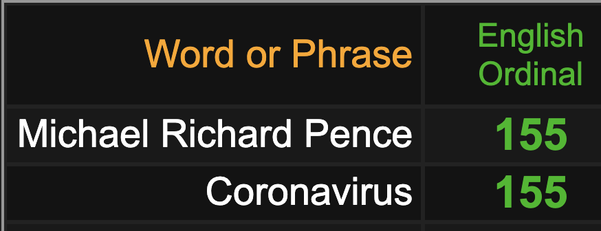 Today is exactly 48-weeks after the 48th Vice President’s birthday, or you could also say it is his 337th day of his age, which is the 68th prime number. Remember, the term coronavirus was coined in 1968. *Donald Trump = 48. *Donald John Trump = 68 *Wuhan = 68