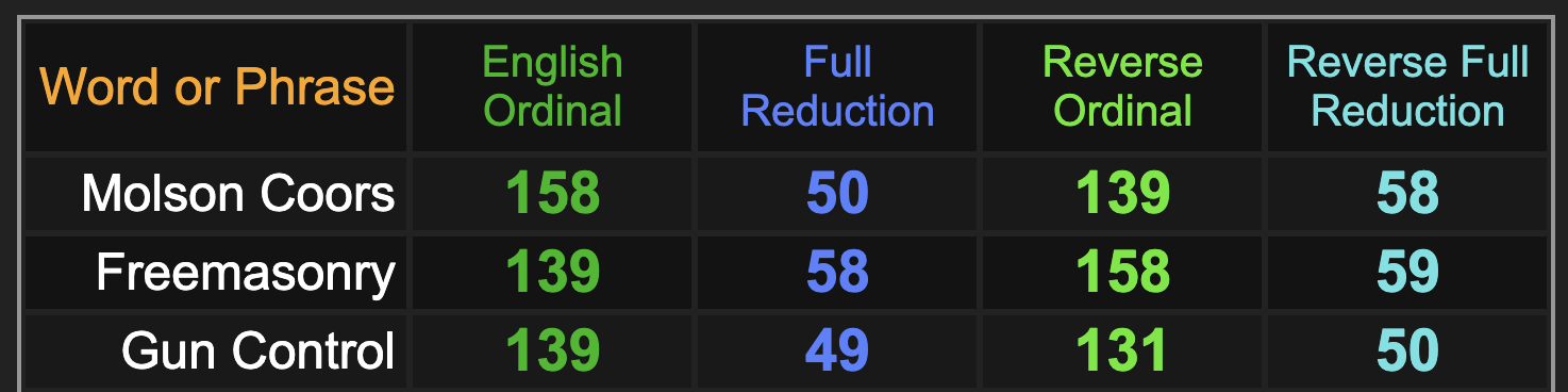 Notice it is as the Molson Coors plan, having gematria connecting to ‘gun control’, as well as ‘Freemasonry’.