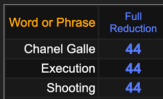 Forwards, her name sums to 44, like ‘shootinig’, ‘execution’ and ‘kill’.
