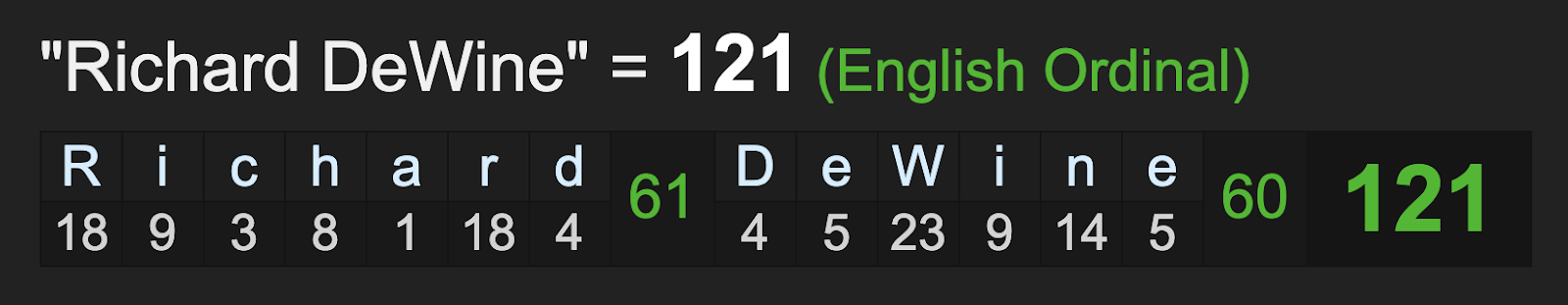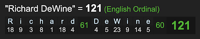 His birth name, Richard DeWine, has the 121 connection as well.