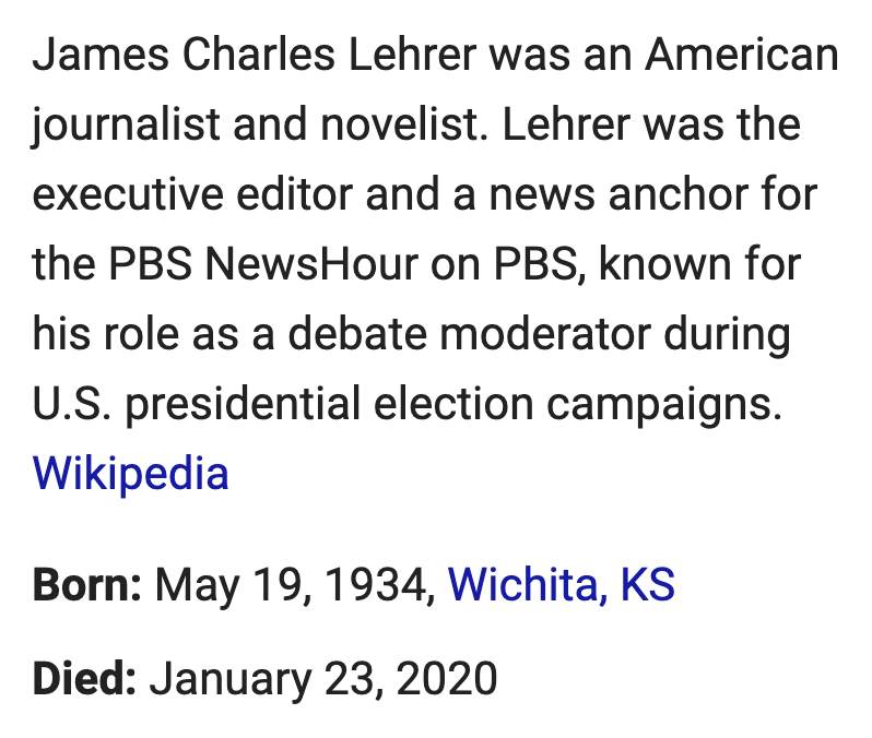 PBS NewsHour anchor Jim Lehrer dead at 85, January 23, 2020