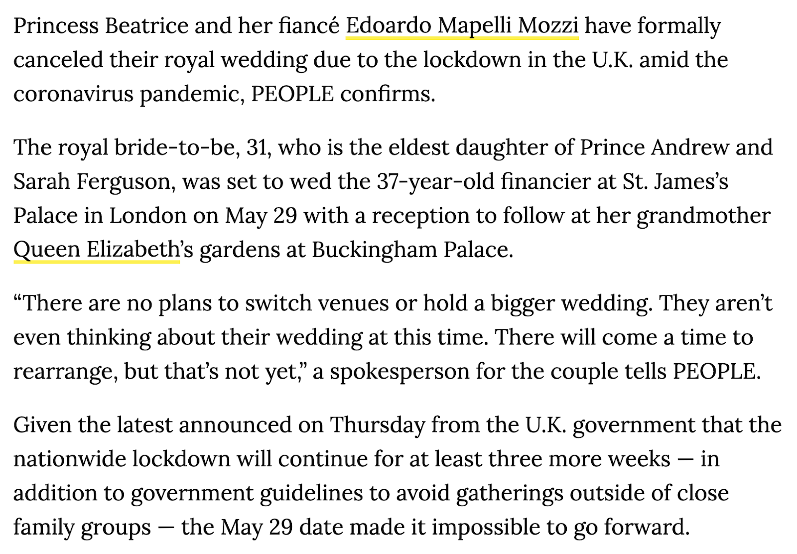 Princess Beatrice cancels her Royal Wedding, April 16, 2020, which was scheduled for May 29, 2020