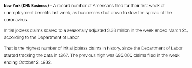Record unemployment claims soar to 3.3 million, March 26, 2020, due to “coronavirus”