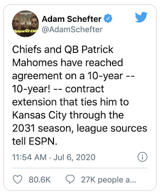 Ritual | Patrick Mahomes signs $400-million plus deal with Kansas City Chiefs, July 6, 2020, 5 months and 4 days after Super Bowl 54, reminding he is the 33rd person to win the Super Bowl as QB
