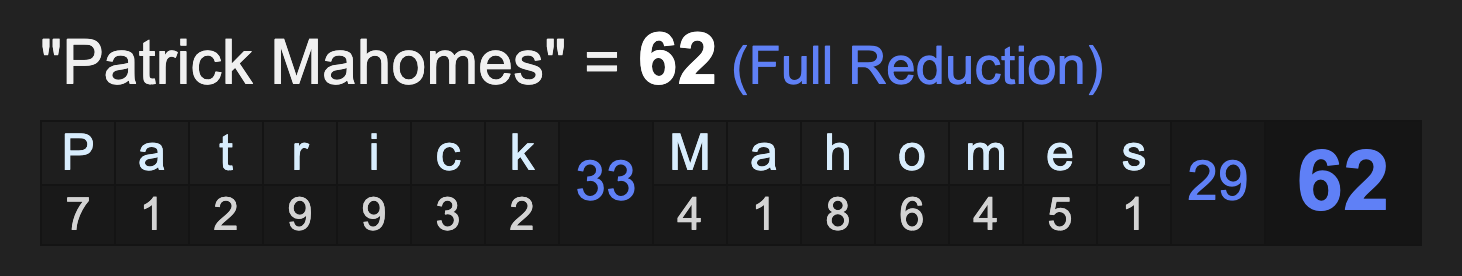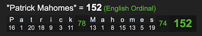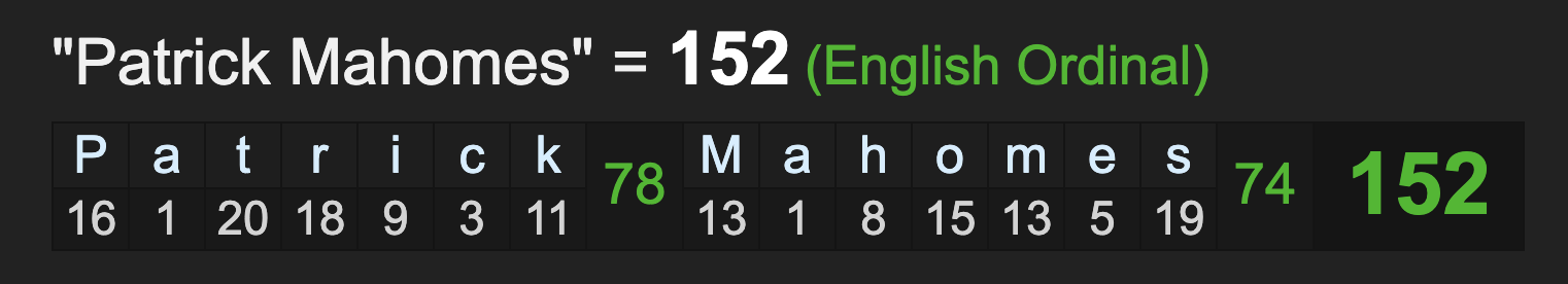 Also, notice the name Patrick Mahomes sums to 152.